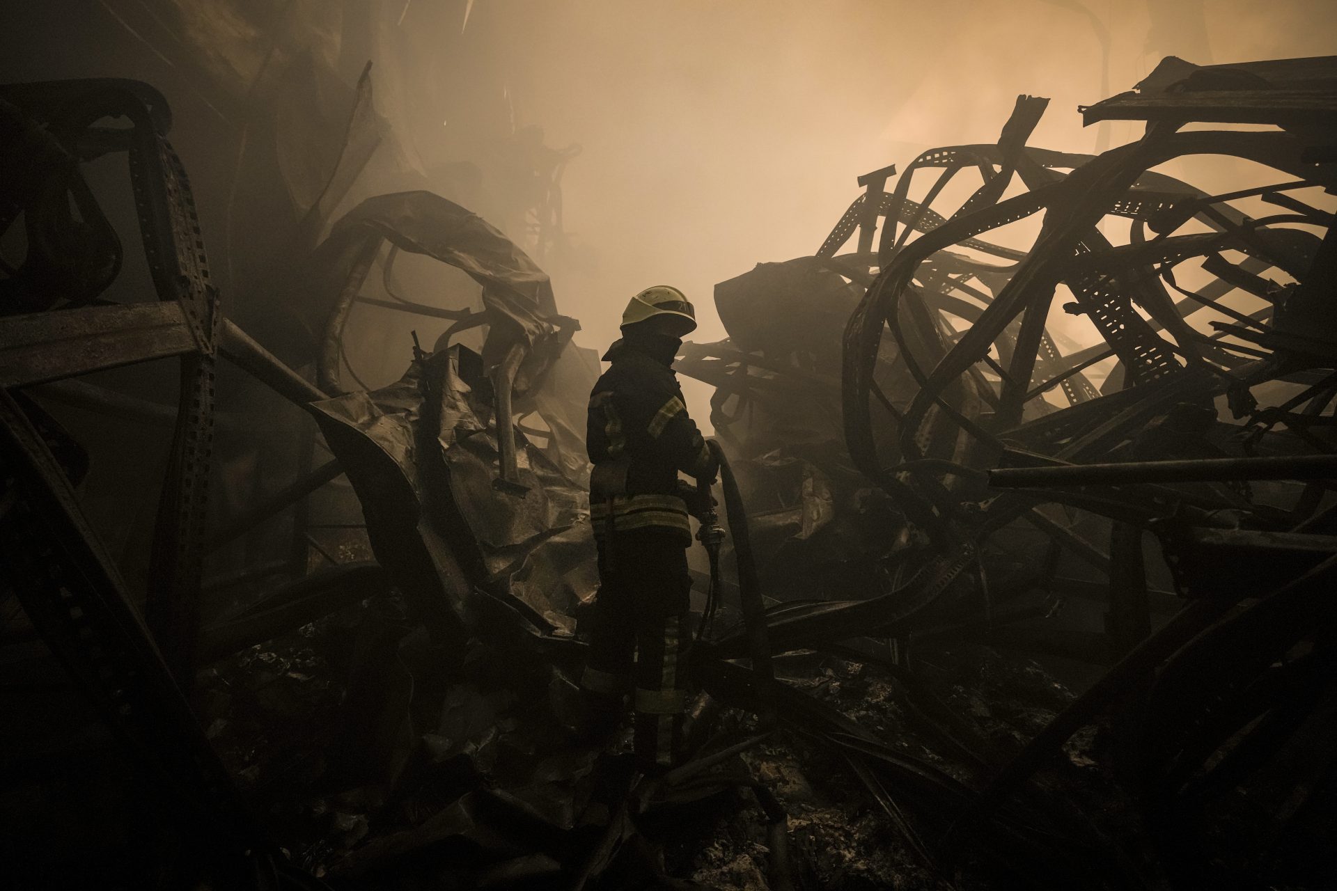 A Ukrainian firefighter drags a hose inside a large food products storage facility which was destroyed by an airstrike in the early morning hours on the outskirts of Kyiv, Ukraine, Sunday, March 13, 2022. Waves of Russian missiles pounded a military training base close to Ukraine’s western border with NATO member Poland, killing 35 people, following Russian threats to target foreign weapon shipments that are helping Ukrainian fighters defend their country against Russia’s grinding invasion.(AP Photo/Vadim Ghirda)