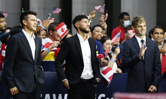 International soccer players, from left, Hirving “Chucky” Lozano, Jonathan Osorio and Christian Pulisic wait along 6th Ave. for FIFA’s announcement of the names of the host cities for the 2026 World Cup soccer tournament, Thursday, June 16, 2022, in New York.