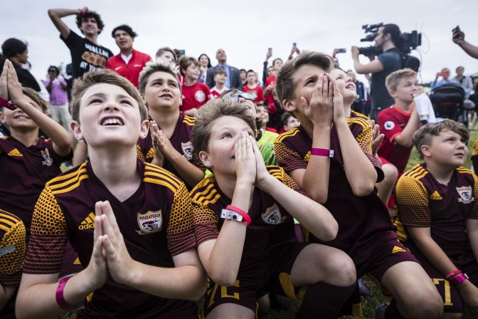 Children from the Massapequa youth soccer team wait for an announcement of host cities, at a 2026 FIFA World Cup host city selection watch party at Liberty State Park in Jersey City, N.J., Thursday, June 16, 2022.