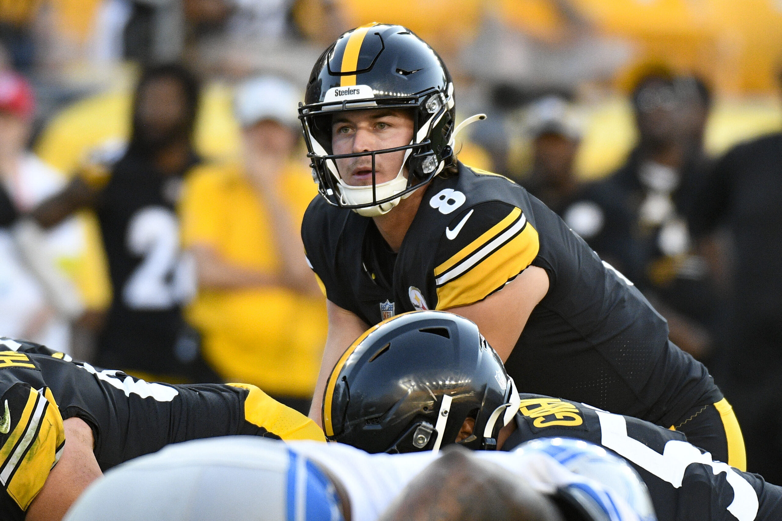 Pittsburgh Steelers quarterback Kenny Pickett (8) call signals at the line of scrimmage as he plays against the Detroit Lions during the second half of an NFL preseason football game, Sunday, Aug. 28, 2022, in Pittsburgh. (AP Photo/Don Wright)