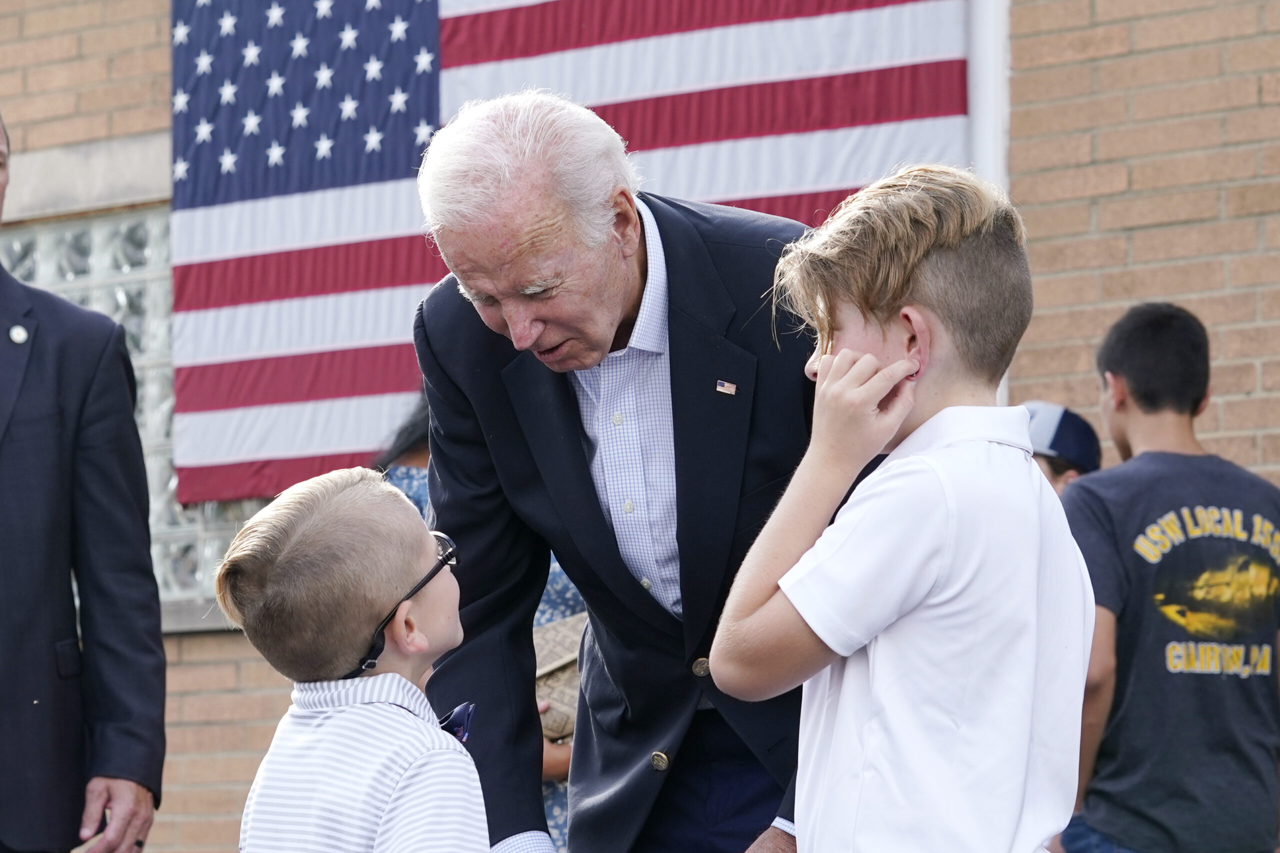 President Joe Biden talks to children before speaking at a United Steelworkers of America Local Union 2227 event in West Mifflin, Pa., Monday, Sept. 5, 2022, to honor workers on Labor Day. (AP Photo/Susan Walsh)