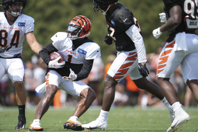 Cincinnati Bengals wide receiver Ja’Marr Chase (1) makes a catch during NFL football training camp Wednesday, Aug. 10, 2022, in Cincinnati. (AP Photo/Jeff Dean)