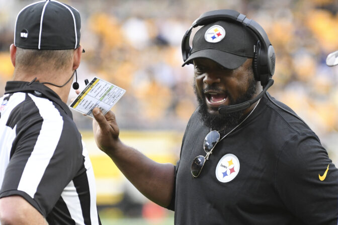 Pittsburgh Steelers head coach Mike Tomlin, right, talks to an official during the first half of a preseason NFL football game against the Seattle Seahawks, Saturday, Aug. 13, 2022, in Pittsburgh. (AP Photo/Fred Vuich)