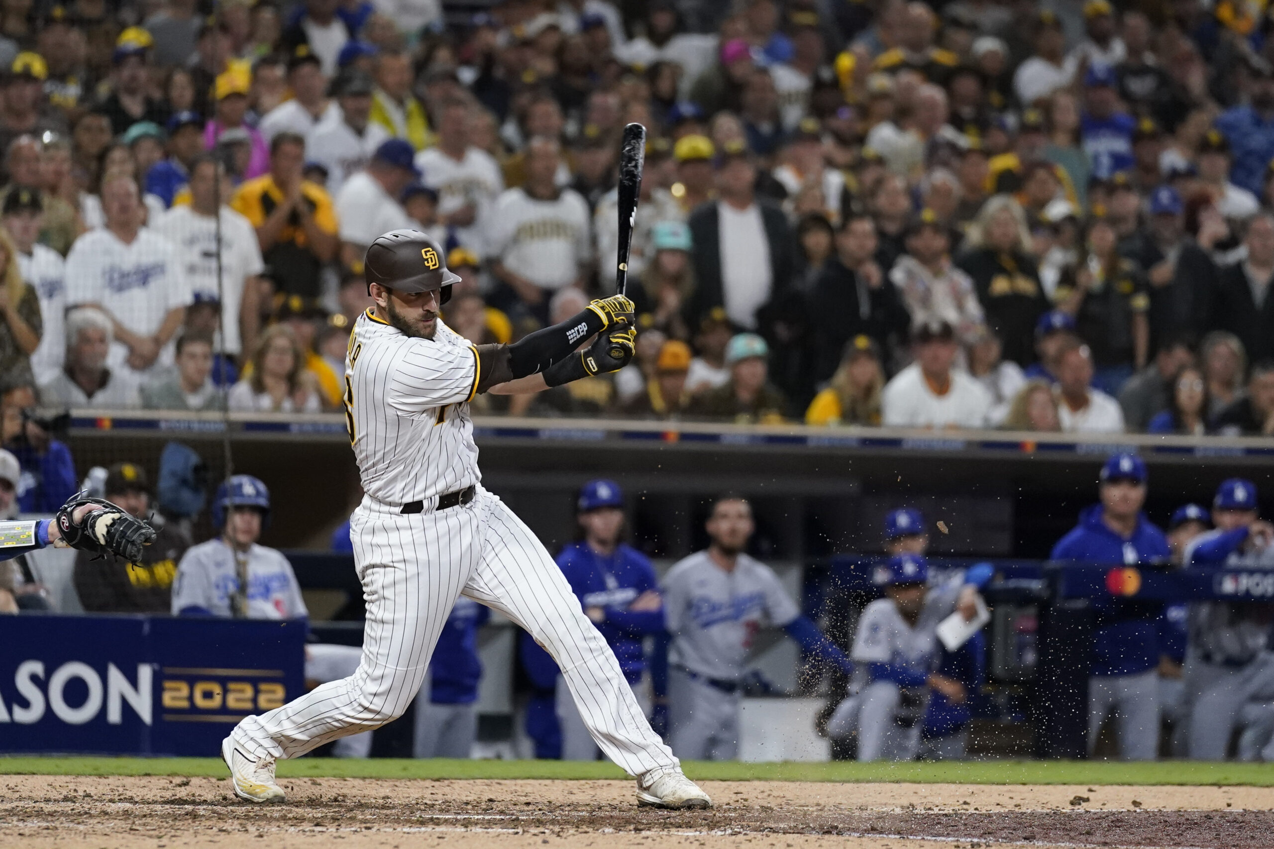 San Diego Padres’ Austin Nola watches his RBI single during the seventh inning in Game 4 of a baseball NL Division Series against the Los Angeles Dodgers, Saturday, Oct. 15, 2022, in San Diego.