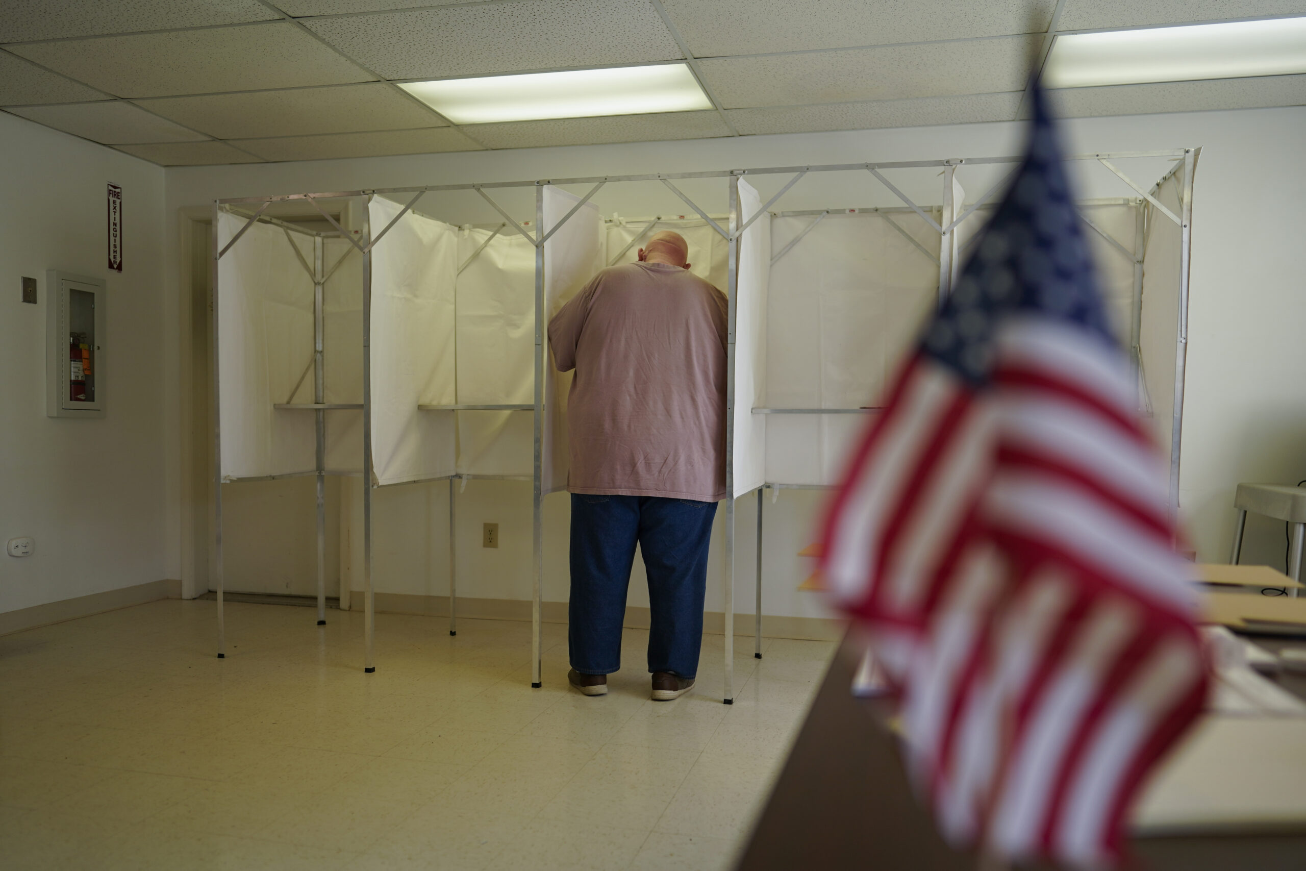 FILE – A voter fills out a ballot during the Pennsylvania primary election at the Michaux Manor Living Center in Fayetteville, Pa., May 17, 2022. As the 2022 midterm elections enter their final two-month sprint, leading Republicans concede that their party’s advantage may be slipping even as Democrats confront their president’s weak standing, deep voter pessimism and the weight of history this fall. (AP Photo/ Carolyn Kaster, File)